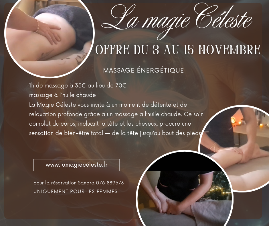 Massage énergétique – Un voyage vers l’équilibre intérieur Je vous propose un massage énergétique complet, un véritable soin qui agit de la tête aux pieds. Inspiré des principes de la réflexologie et des techniques énergétiques, ce massage vise à réharmoniser la circulation des énergies dans tout le corps, libérer les tensions et favoriser une profonde …